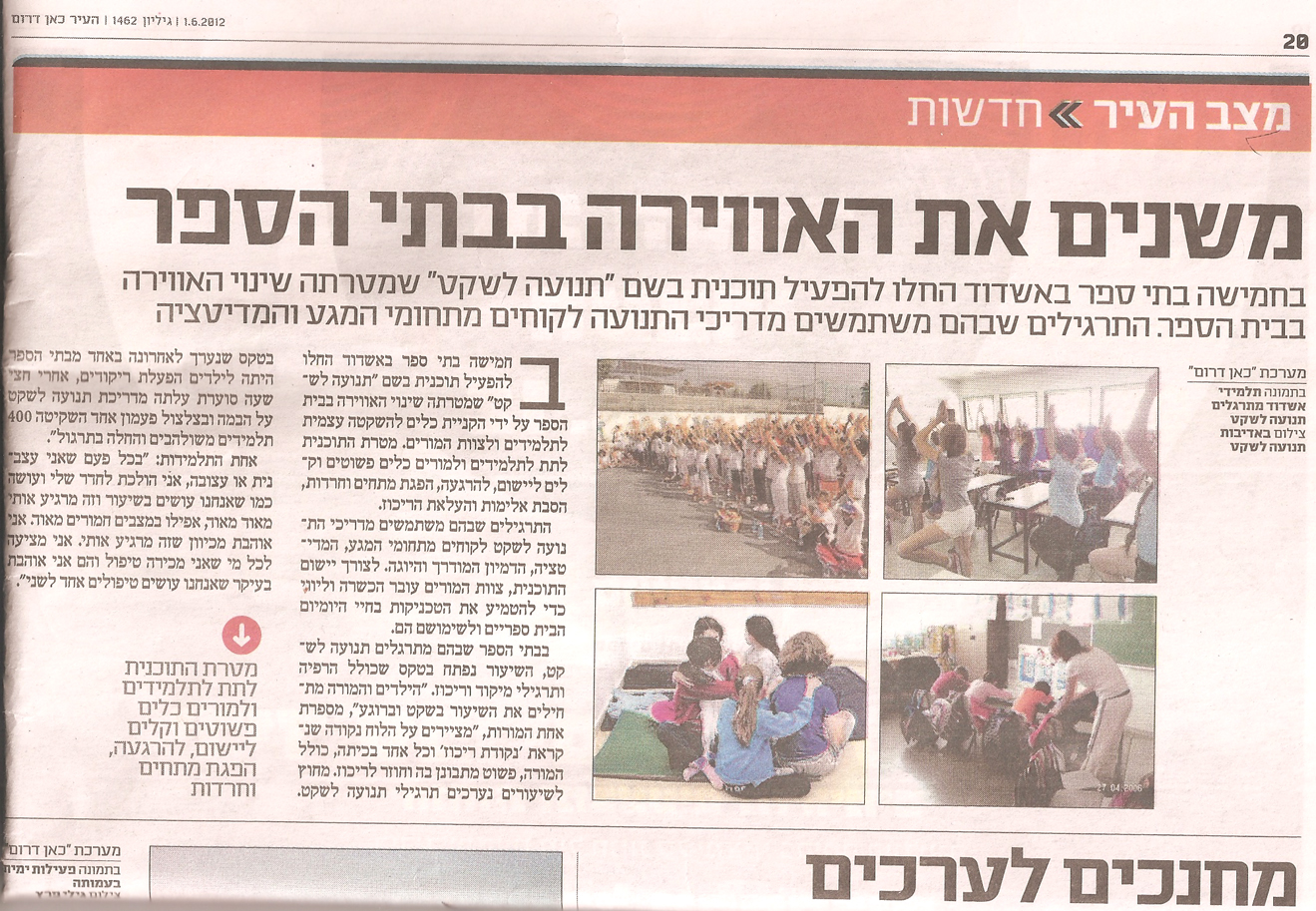 יוני 2012, כתבה במקומון "כאן אשדוד", עם עדויות ממקור ראשון, ילדי ביה"ס, על תרומתה של הפעילות שלנו על חיי היום-יום שלהם. |